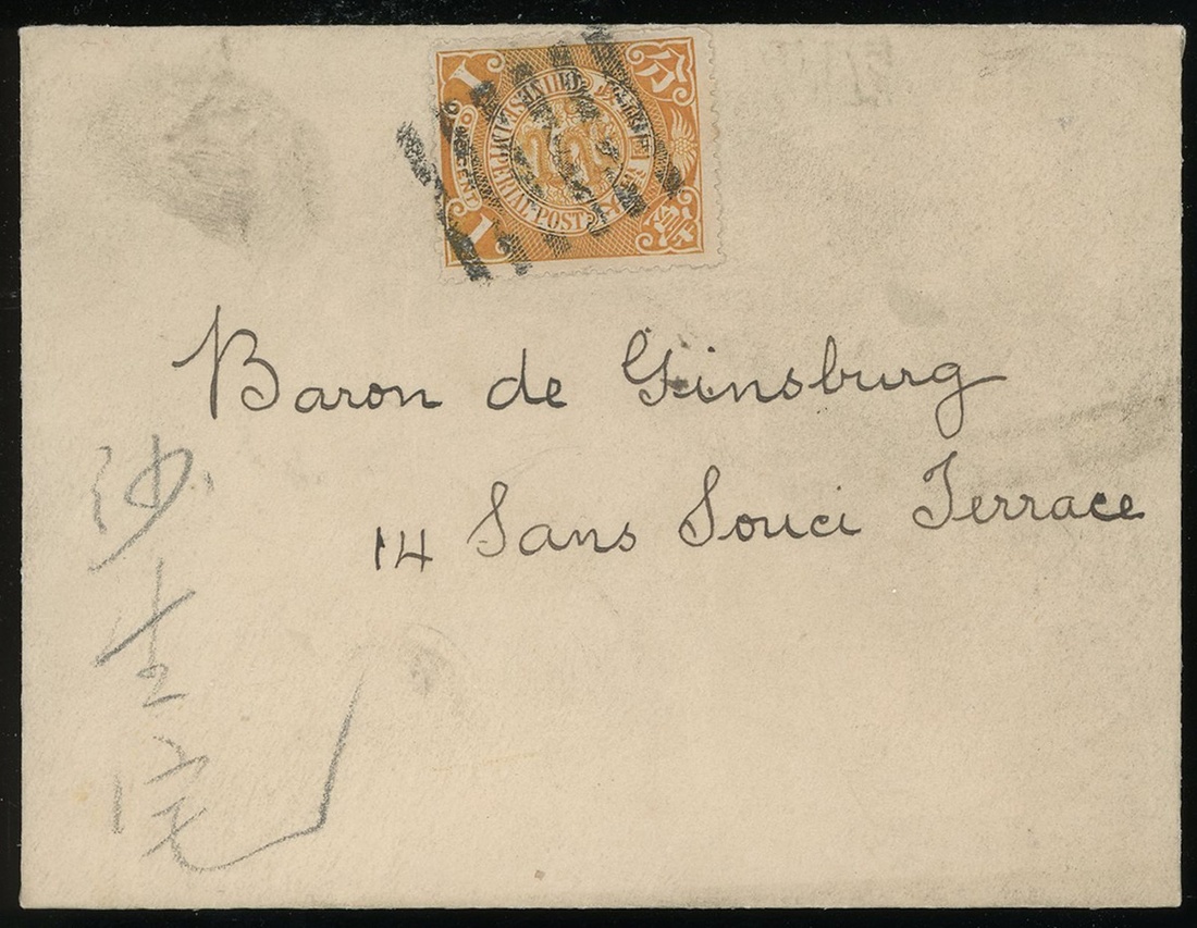 1899 (13 Mar.) An envelope to local address, bearing a 1c stamp, tied by Shanghai pakua cancel and Shanghai Local Post c.d.s. on the back