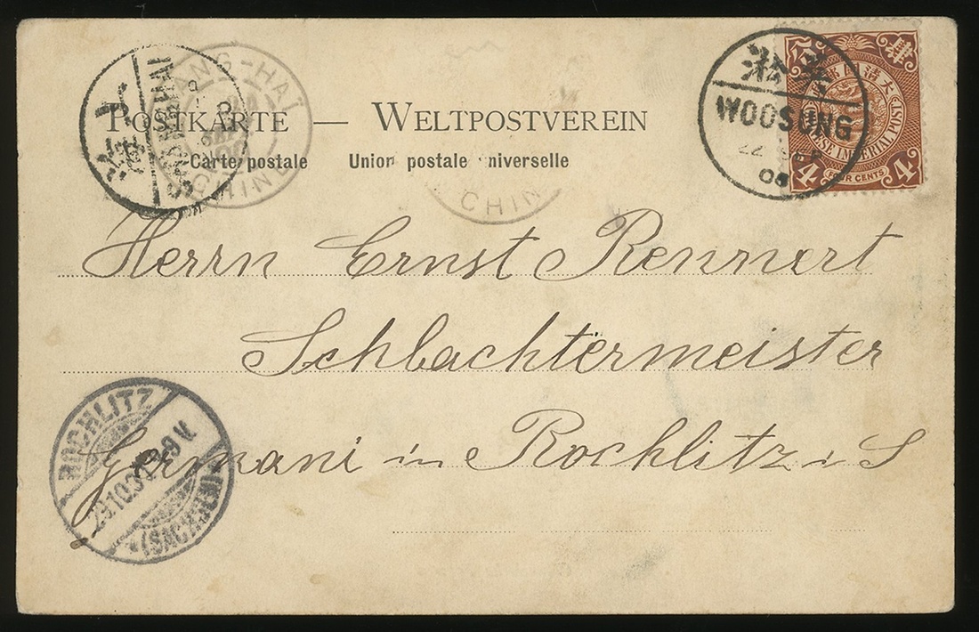1900 (22 Sep.) picture postcard to Germany bearing C.I.P. 4c. tied by Woosung c.d.s., showing Shanghai (22.9) and French P.O. in Shanghai (24.9) transit c.d.s., with Germany arrival c.d.s. (29.10), fine.