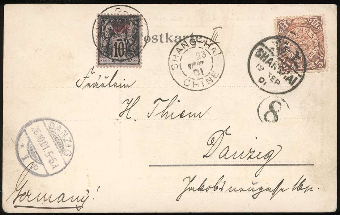1901 (19 Sept.) postcard to Danzig bearing C.I.P. 4c. tied by Shanghai c.d.s., with France "Chine" 10c. tied by Shanghai Chine (23.9) c.d.s., Danzig arrival c.d.s. (26.10) alongside, the reverse with an offset Shanghai Chine c.d.s.