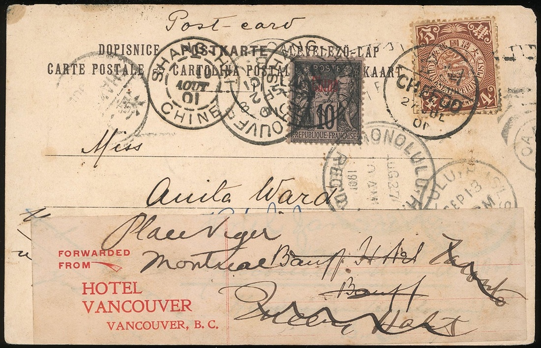 1901年煙臺寄加拿大溫哥華明信片1件,貼倫敦版蟠龍4分1枚,法國客郵10分1枚,蟠龍銷煙臺7月27日小圓戳,經上海及美國夏威夷中轉,有上海小圓戳,法國客郵銷上海8月10日戳,夏威夷8月27日戳,及溫哥華9月28日到達戳,因地址有誤在溫哥華貼改寄條改寄班夫,另有班夫30日到達戳,郵路複雜清晰,保存完好