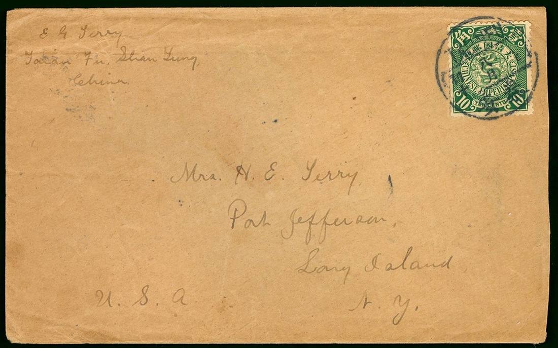 1908年泰安寄美國實寄封1件,貼倫敦版蟠龍10分1枚,銷泰安戊申八月初十英漢腰框戳,經濟南,上海中轉,有山東濟南雙圈三格干支戳,濟南小圓戳,上海小圓戳,上海日本客郵日戳,及美國三藩市機蓋中轉戳,郵路清晰,保存完好