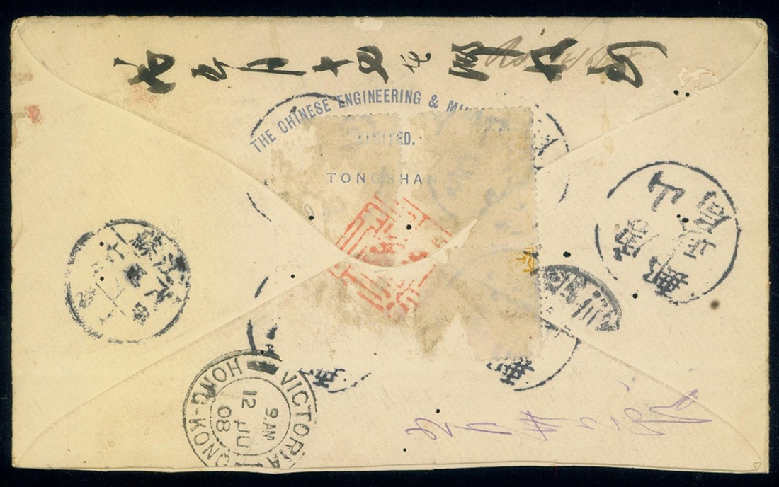 1908 (June) cover from Tangshan via Shanghai to Hong Kong, on the reverse, missing block of four C.I.P. 1c.? tied by Tangshan Chinese no date postmark, good other stirke alongside, Hong Kong arrival c.d.s. (12.6) on top of cover.