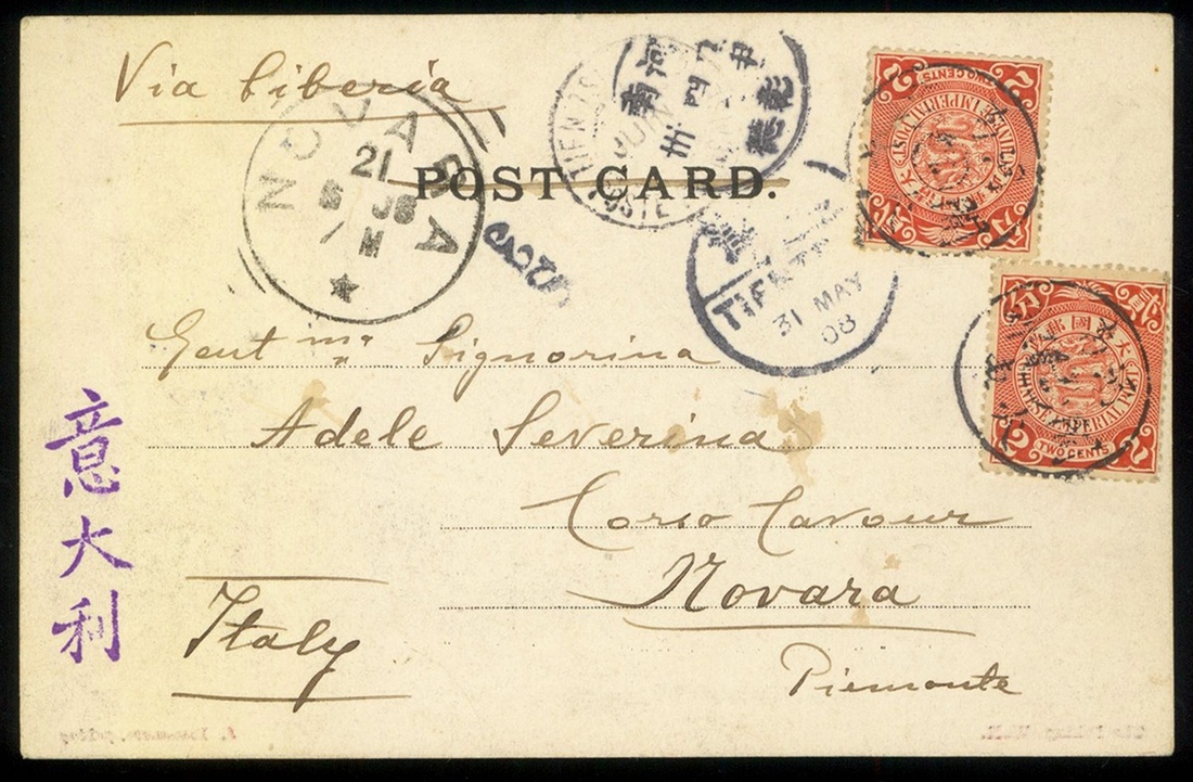 1908年河南寄義大利明信片1件,貼倫敦版蟠龍紅2分2枚,銷河南開鄭火車太極圖C型火車郵戳,經彰德,天津中轉,依次有河南彰德戊申四月三十日單圈三格式干支戳,天津5月31日小圓戳,天津6月1日法國客郵日戳,及義大利6月21日到達戳,片背圖北京城牆及駝隊,保存完好。開鄭火車太極圖郵戳為1936年趙善長先生首次發現,並刊於《甲戌郵刊》。因其特別,直到今天還一直受到郵戳愛好者重視。2016年《藝林郵學》年刊龔政先生撰寫文章,首次利用目前所知存世的幾枚完整封片作以系統研究,將其戳分為3種不同戳型,並假設了三種戳型的使用時間段。此片銷戳為C型,使用時間應為1908年5月以後,目前已知三種戳型開鄭火車郵戳均為寄比利時,此片為寄往義大利,較為特殊,開鄭火車太極圖郵戳C型戳完整郵件目前已知存世僅3件,研究清代火車郵政史之重器,可遇不可求