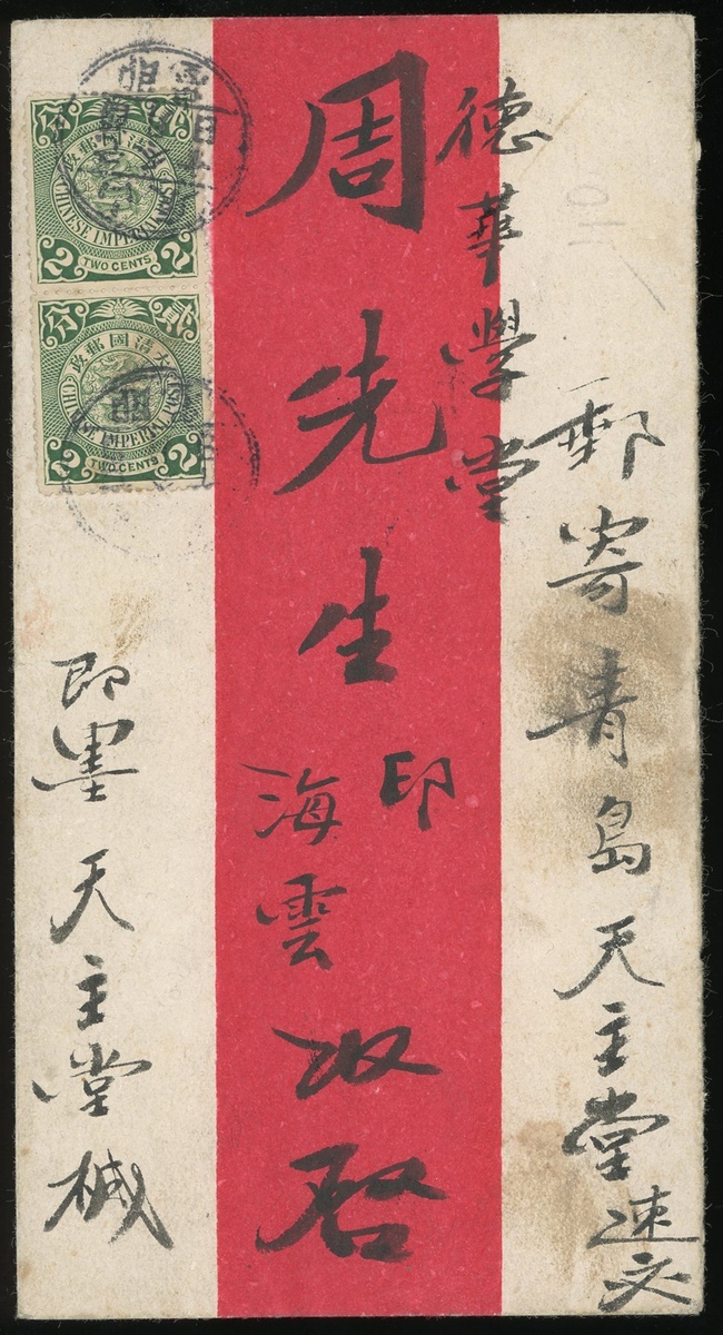 1909 (10 Nov.) A red band cover from Shantung to Tsingtau, bearing 4 cents C.I.P. stamps, tied by Shantung c.d.s., and TSINGTAU KIAUTSCHOU arrival c.d.s.
