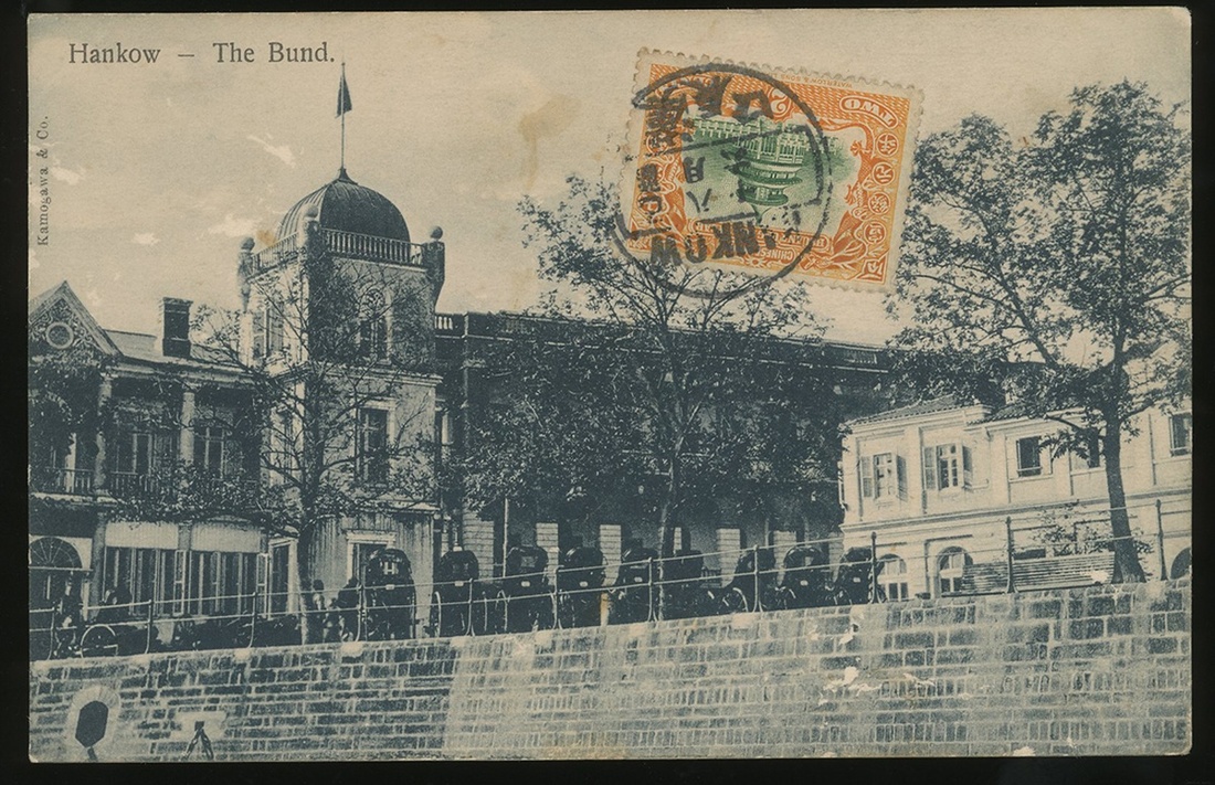 清末漢口題材圖畫明信片1件,背面貼宣統登基紀念郵票2分1枚,銷漢口己酉八月十六英漢辰字腰框戳,保存完好