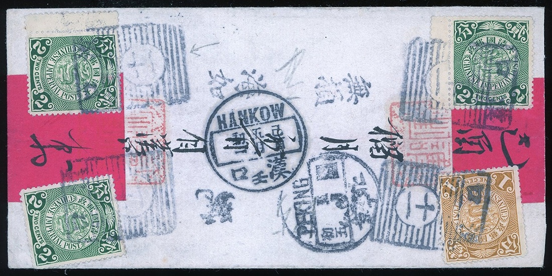 1909年漢口寄北京掛號紅條封1件,貼倫敦版蟠龍1分1枚,綠2分3枚,銷漢口十一碑型信櫃戳,另銷漢口己酉五月初一英漢腰框戳,並蓋湖北省漢口中文掛號戳,及無損戳,有北京五月初五腰框到達戳,郵戳清晰,保存完好