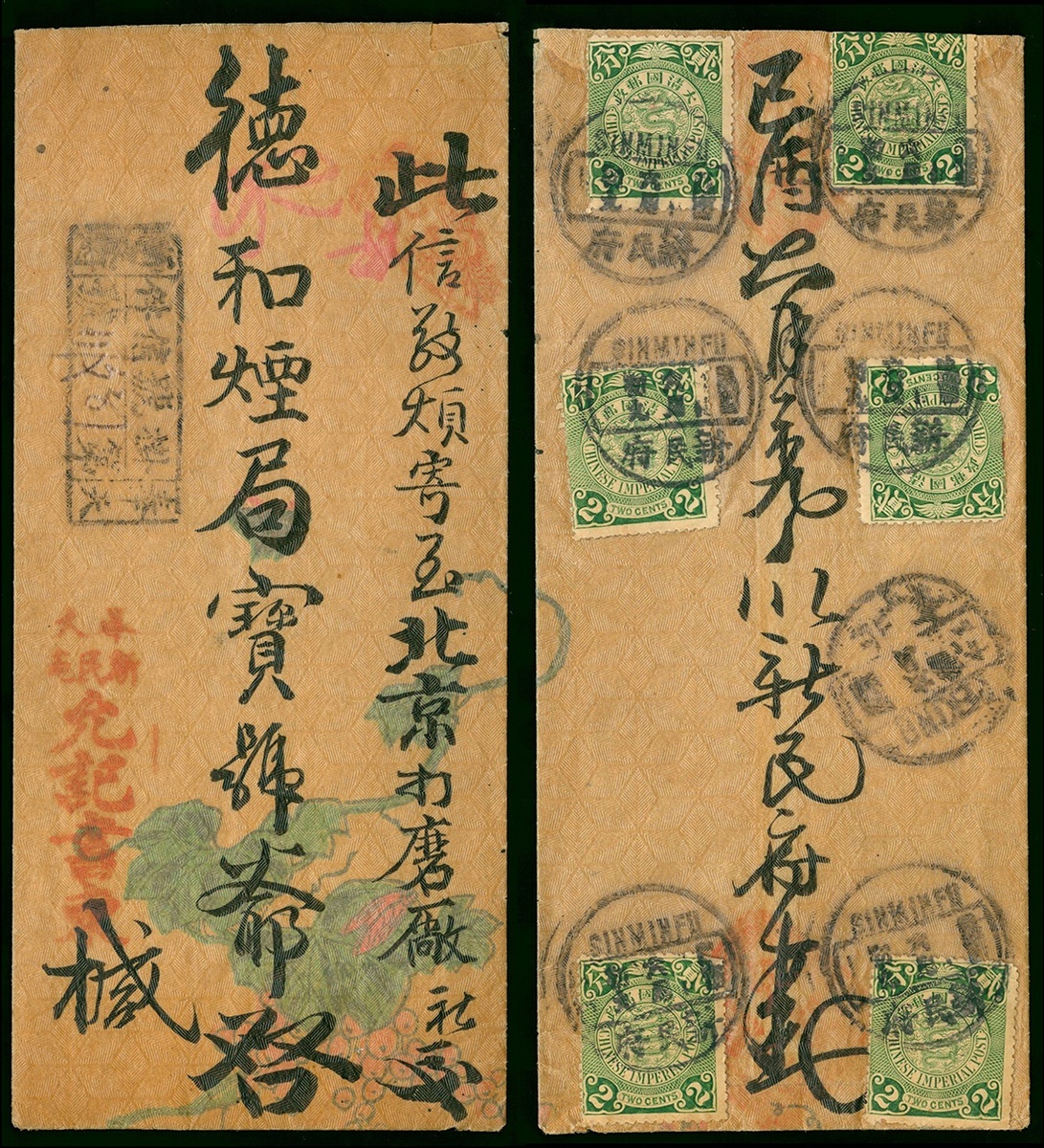1909年奉天新民府掛號寄北京中式仿絹制美術封1件,貼倫敦版蟠龍綠2分6枚,銷新民府己酉六月初九英漢腰框戳,另蓋奉天新民府掛號新建掛號戳,有北京六月十一英漢腰框到達戳,郵戳清晰,保存完好,清代東北小地方寄出掛號郵件少見