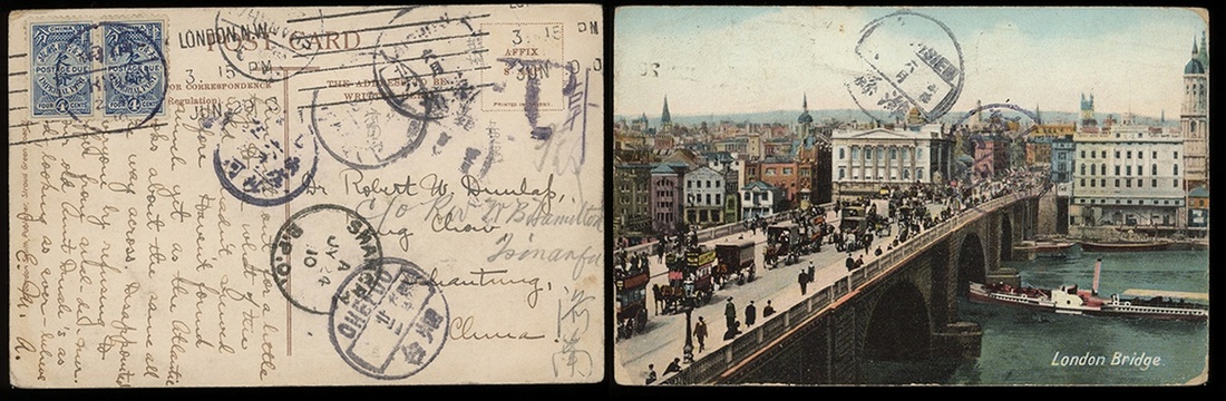1910年英國倫敦寄濟南明信片1件,寄信人未貼郵票,銷倫敦6月20日機蓋戳,郵件經上海英國客郵,上海,煙臺,黃縣,萊州,沙河等地中轉,有各地不同戳式中轉戳,到達濟南後因為納郵資而作欠資處理,蓋T戳,並貼藍欠資4分2枚,銷濟南8月2日小圓戳,另有煙臺六月二十二英漢文腰框到達戳,郵路複雜且清晰,保存完好,少見