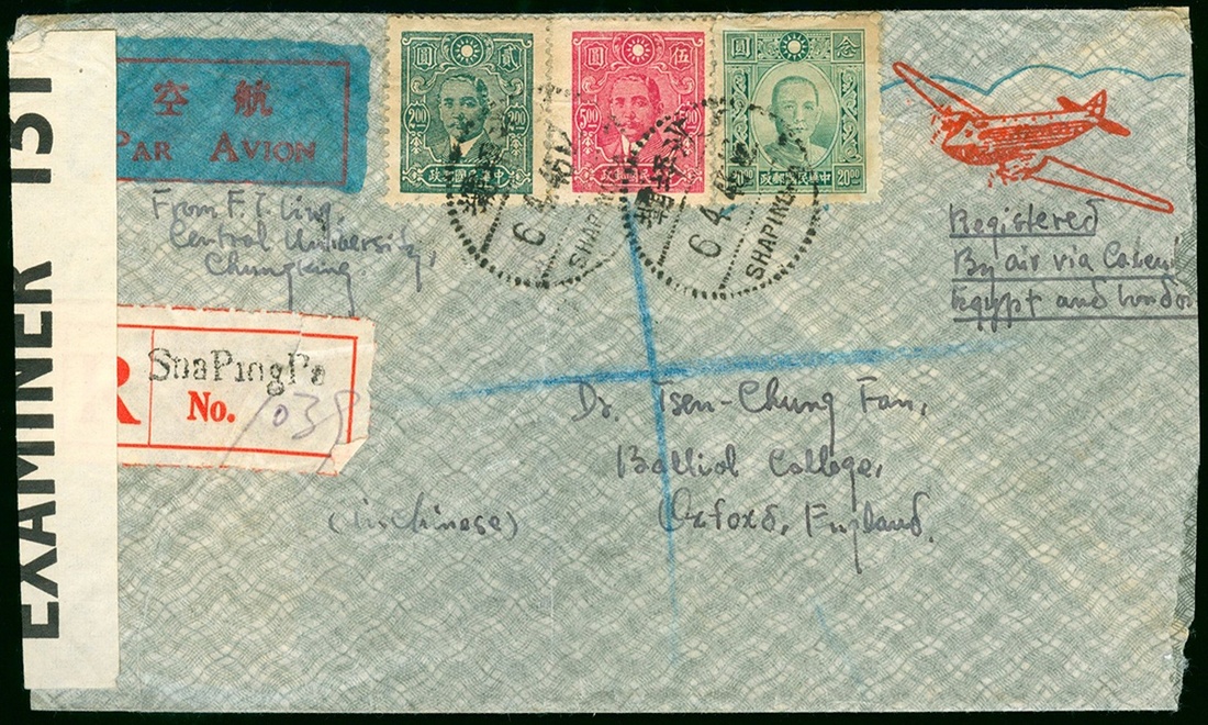 1945 (6 Apr.) to England registered air mail cover, bearing Dr.Sun $2, $5 and $20 each, tied by Shapingpa c.d.s., with censor seal.