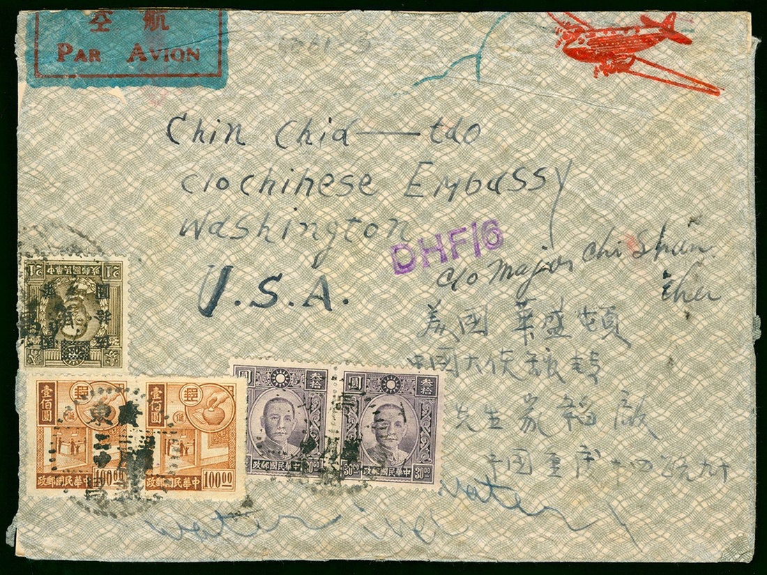 1946年廣東新昌經駝峰郵路航空寄中國駐美國大使館實寄封1件,貼百城一版30元有齒橫雙連,郵政儲蓄100元橫雙連,烈士永甯加蓋國幣50元1枚,銷廣東新昌3月20日戳,背面另蓋少見紀念空軍節擴大一縣一機運動八一四航空宣傳戳,保存完好,少見