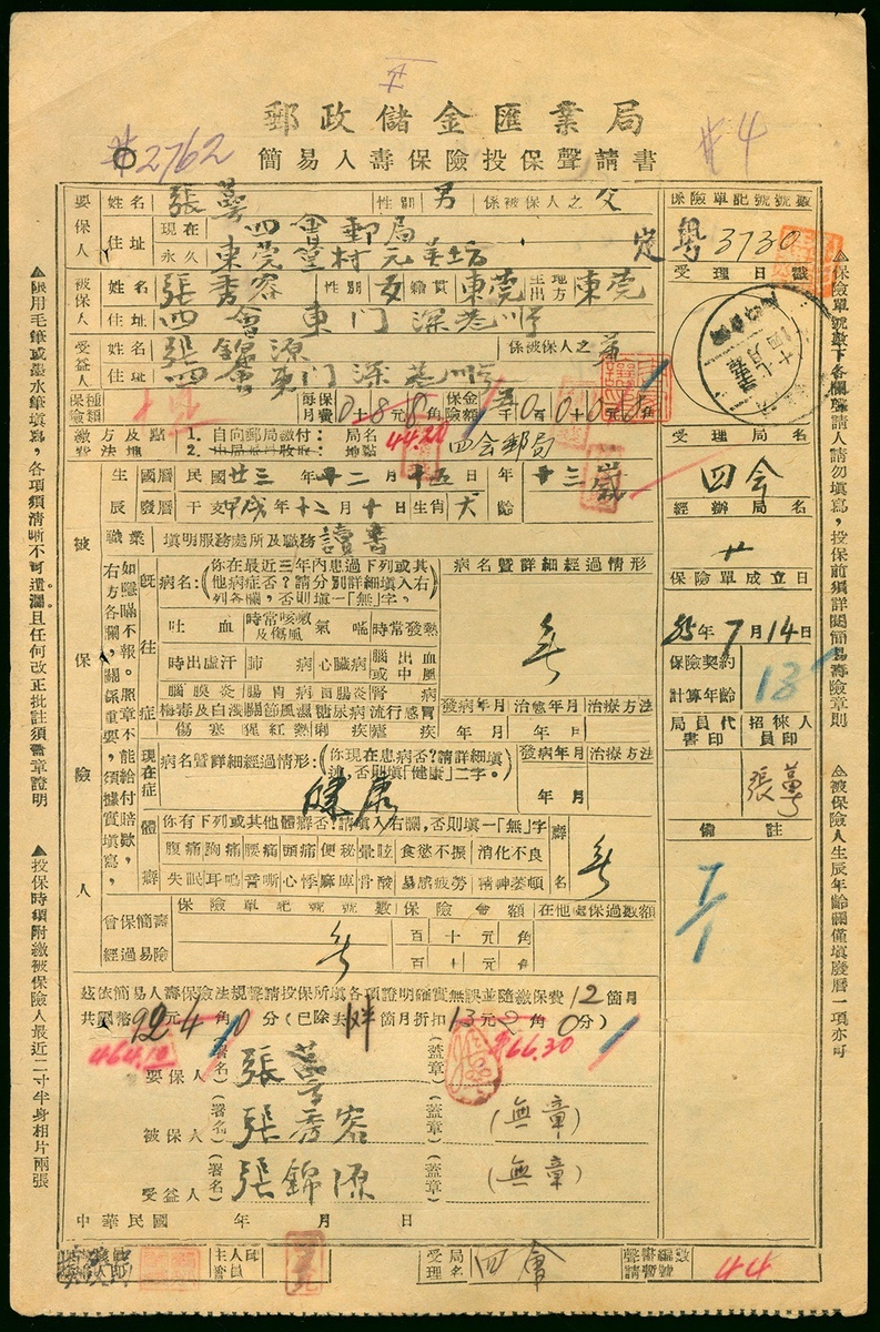 1946年四會郵政儲金匯業局簡易人壽保險投保申請書1件,銷四會郵局簡易壽險7月14日戳,保存完好,難得早期郵政代辦保險業務實物資料,較少見