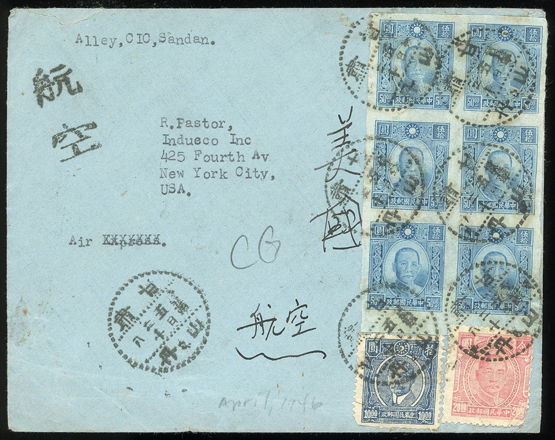 1946年甘肅山丹寄美國航空封1件,貼百城一版孫像50元無齒六方連,重慶中華版孫像20元,重慶大東版10元各一枚,銷甘肅山丹5月30日戳,經蘭州中轉,有蘭州6月4日中轉戳,寄重慶6月7日到達戳,保存完好