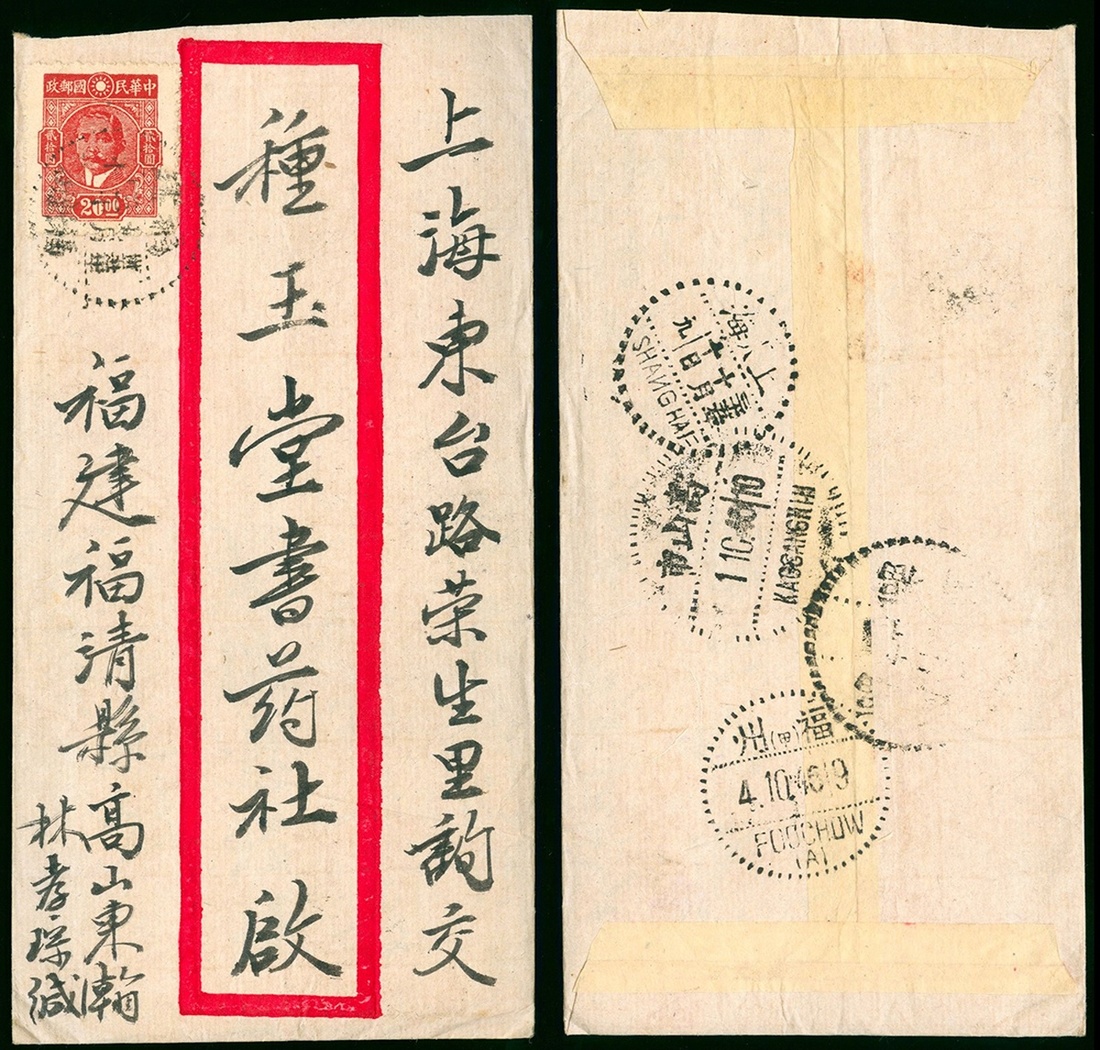 1946 (30 Sept.) red band cover to Shanghai, bearing Dr.Sun $20 tied by Futsing c.d.s., on the reverse with Kaosanshi (1.10) and Foochow (4.10) transit c.d.s. and Shanghai arrival c.d.s.(10.10) alongside.