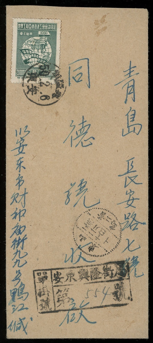1950 (6 Feb.) registered cover from An Doong to Tsingtao, bearing NE Used Trade Union Conference of Asian and Australasian Countries $20,000 tied by An Doong c.d.s., An Doong boxed registered handstamp. Tsingtao arrival c.d.s. (10.2) alongside.