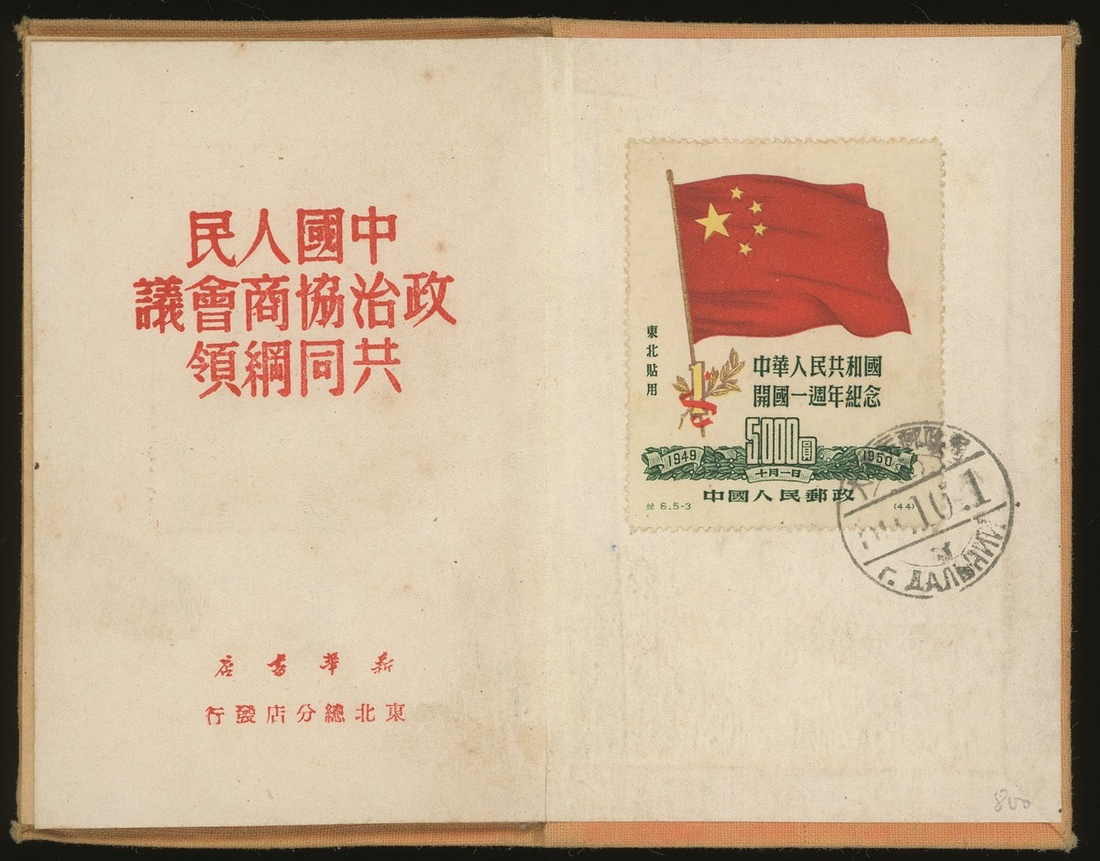 1950 (1 Oct.) hand book of "Common Program of the Chinese People's Political Consultative Conference" Inside the cover with NE used 1st Anniv. of Founding of PRC $5,000 tied by Dalian Post Office c.d.s., in fine condition.