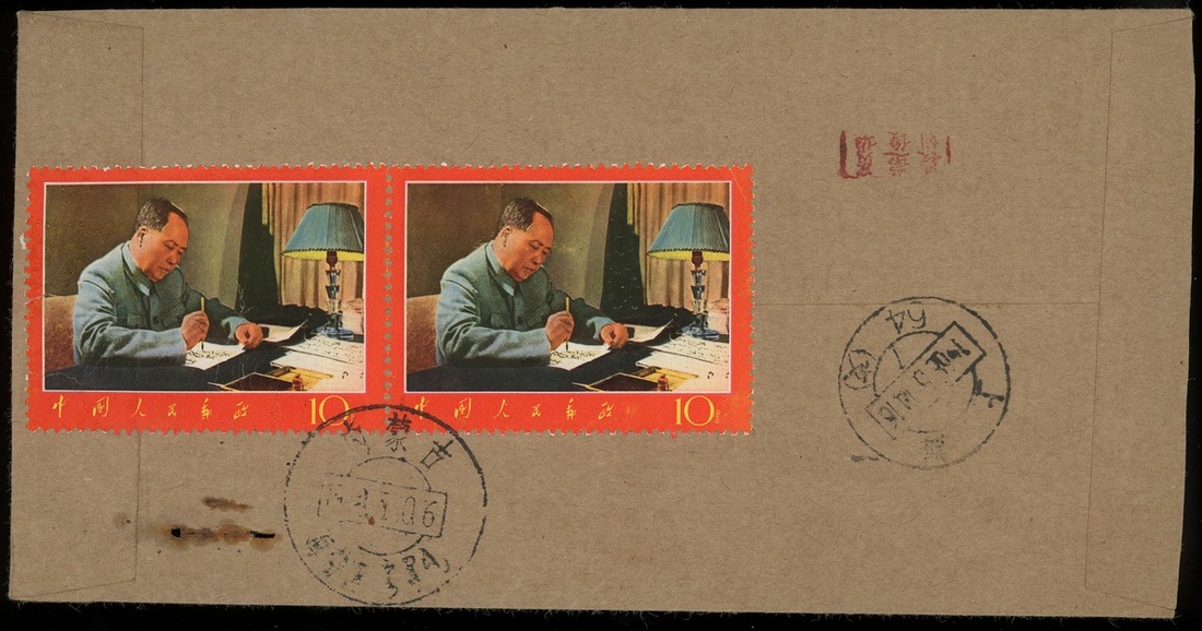 1968 (10 May) a registered cover to Shanghai bearing 10c. (W7) pair tied by Inner Mongolia bilingual c.d.s. Shanghai (14.5.) arrival c.d.s.