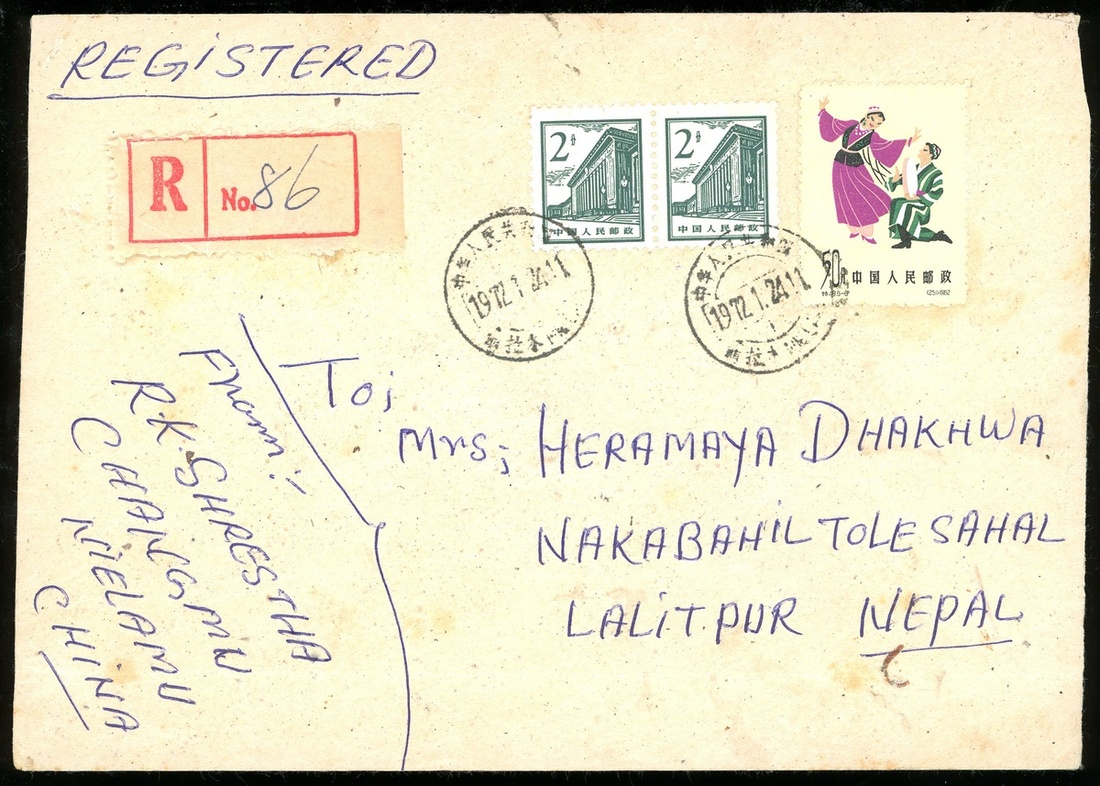 1972 (24 Jan.) registered from Tibet cover to Nepal, bearing a pair of R13 2c. and S49 50c., tied by Nielamu customs c.d.s., registered seal No. 86 alongside. on the reverse with Nepal arrival c.d.s. fine condition.