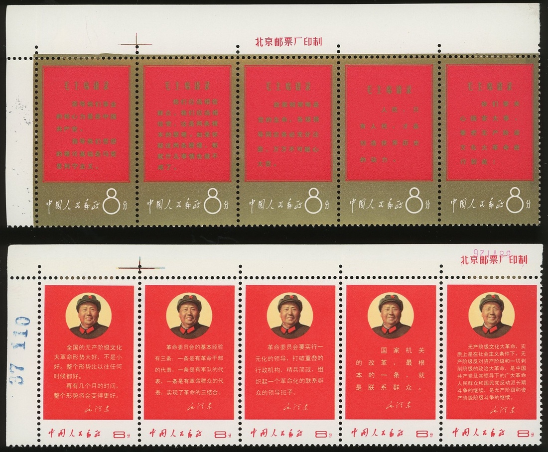 1967-68 W series; a complete collection with Long Live Invincible Chairman Mao (W1) with imprints, Our Great Teacher (W2), Revolutionary Literature and Art (W5), Poems of Mao (W7), Directives of Chairman Mao (W10) with imprint, Defense of Chen Pao-Tao with imprints. All are fine, unmounted mint. Yang W1-81. (80)