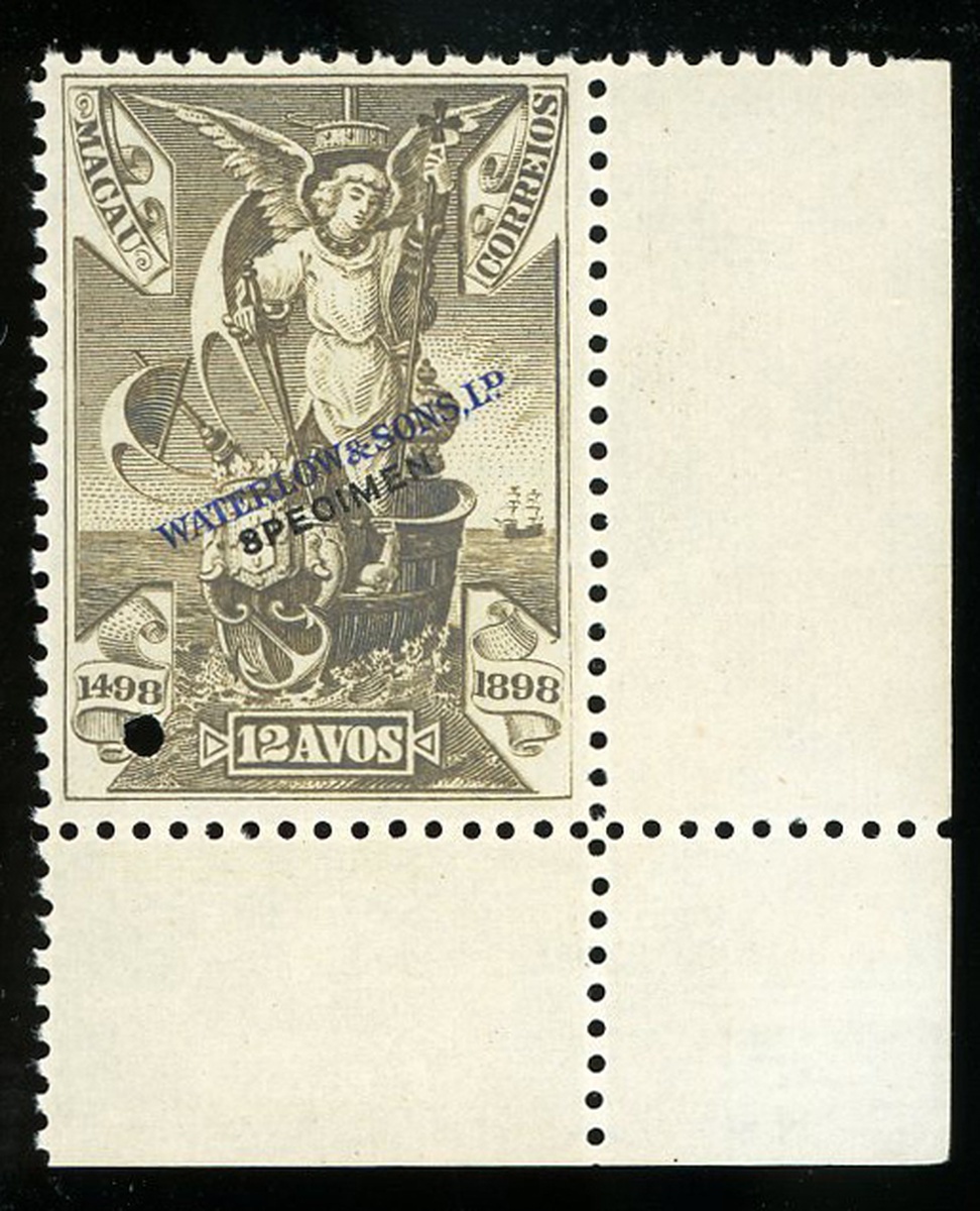 1898 400th of Vasco da Gama's Discovery of Route to India 12a. chocolate, lower right margin with a punch hole, Waterloo and Sons Ltd. Specimen.