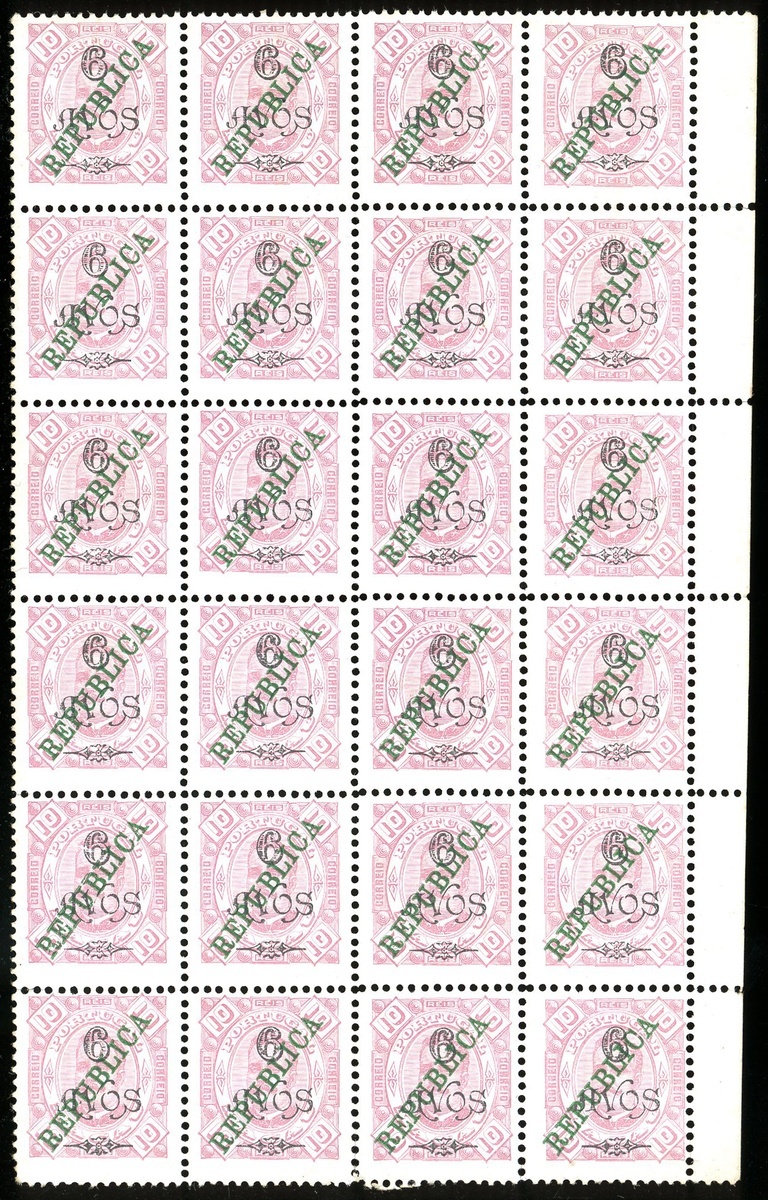 1915 Carlos 6a. on 10r. overprinted ' REPUBLICA' block of 24, unused.