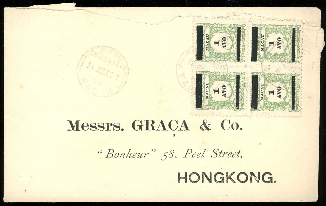 1911 (Apr.) two Macao to Hong Kong cover, each cover bearing postage due surch. 1avo block of four. tied by 11 Apr. or 12 Apr. c.d.s. and with Hong Kong arrival (11.4 or 13.4) c.d.s. on the reverse.