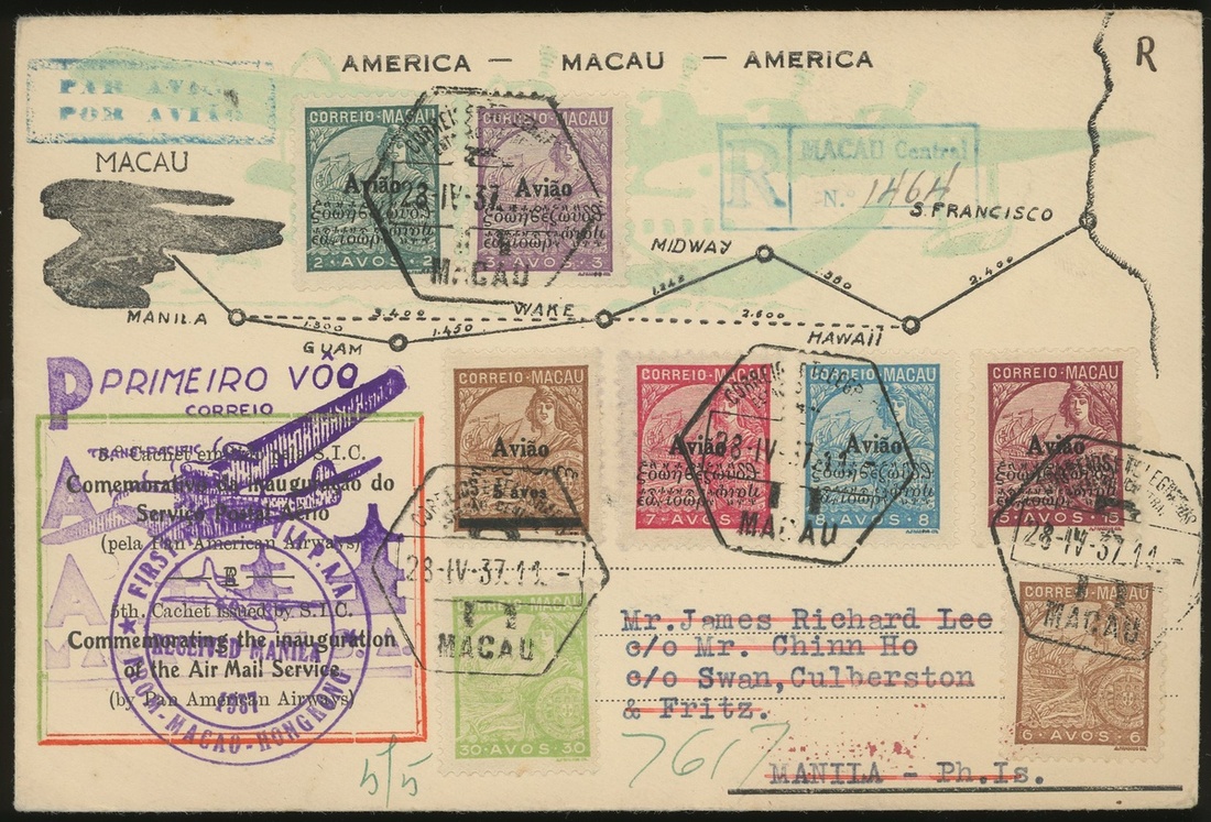 1937 (28 Apr.) First flight registered cover, bearing full set of "Stamps of Padroes (1934) with