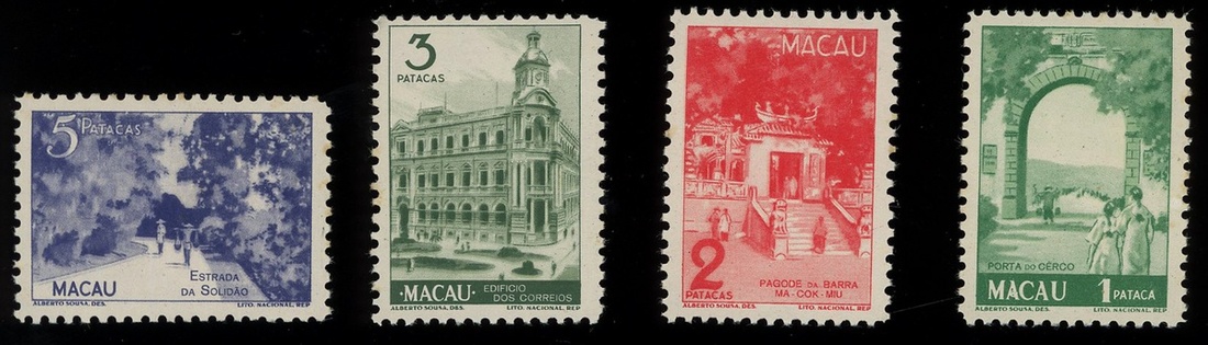 1944-97 over 500 Macau unused and used stamps in album: including 1944 unused complete set of views of Macau 1st series; 1949 75th Anniversary of universal Postal Union (unused); 1951 Macau & Portuguese colonies Holy Year omnibus souvenir sheet; 1951 unused complete set of Junk of Macau; 1953 unused complete set of Macau flowers and others. fine to good. Please preview.