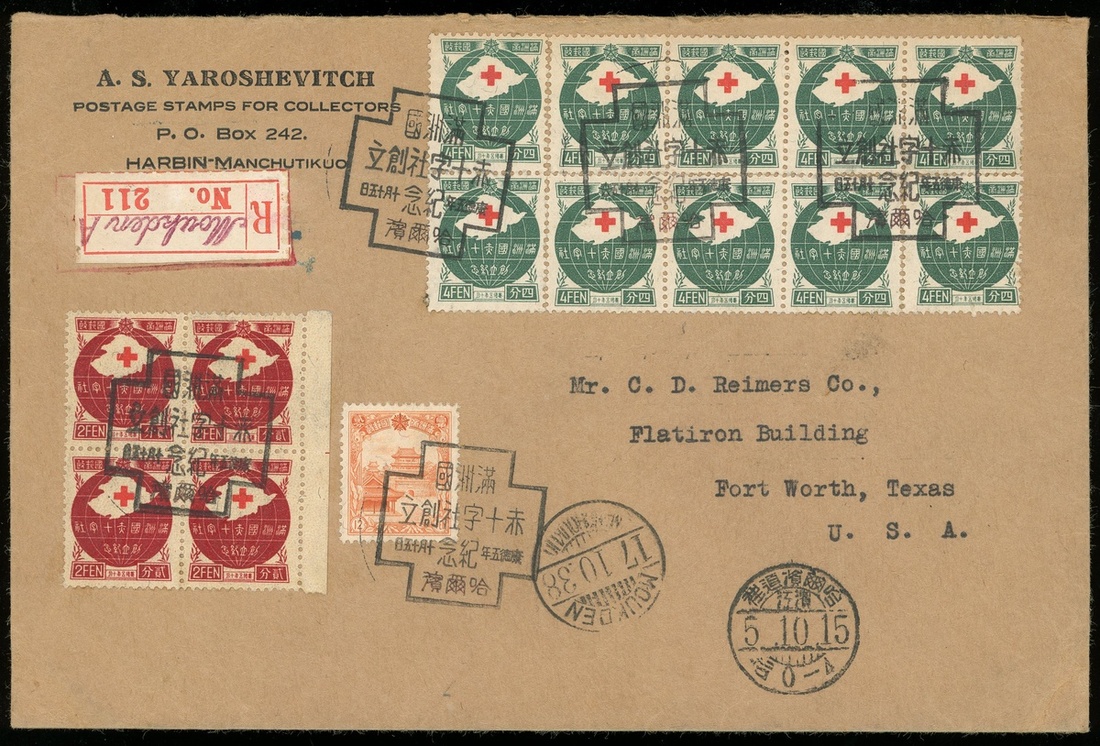 1936 (15 Oct.) to U.S.A. registered cover, bearing Red Cross 4f. block of ten, 2f. block of four and one 4th regular12f. tied by Manchukuo Harbin Red Cross Memorial Postmark, on the reverse with U.S.A. arrival c.d.s. (7.11).