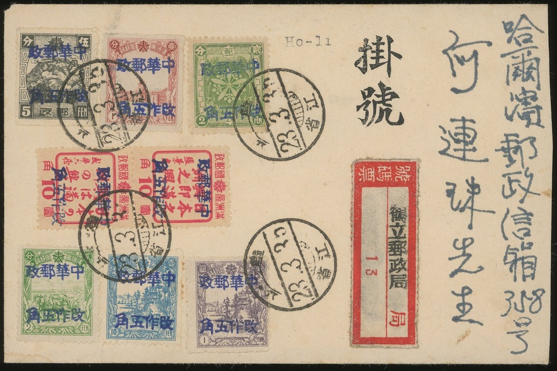1946 (23 Mar.) a registered cover to Harbin bearing MOL overprinted various franking $4 rate tied by Hok Li c.d.s. and registered label alongside.