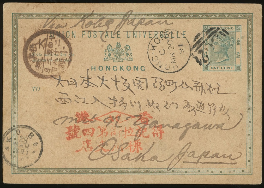 1891 (20 Mar.) 1c. Q.V. stationery card to Japan tied by B62 with Hong Kong c.d.s. via Kobe (28.3.) and Osaka (28.3.) arrival c.d.s.