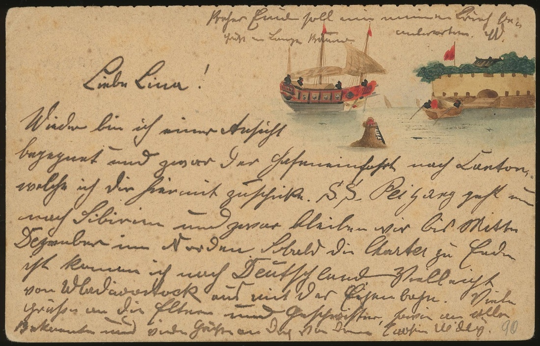 1900 (26 Apr.) 4c. on 3c. Q.V. stationery card to Germany tied by Hong Kong c.d.s., hand painting on reverse.