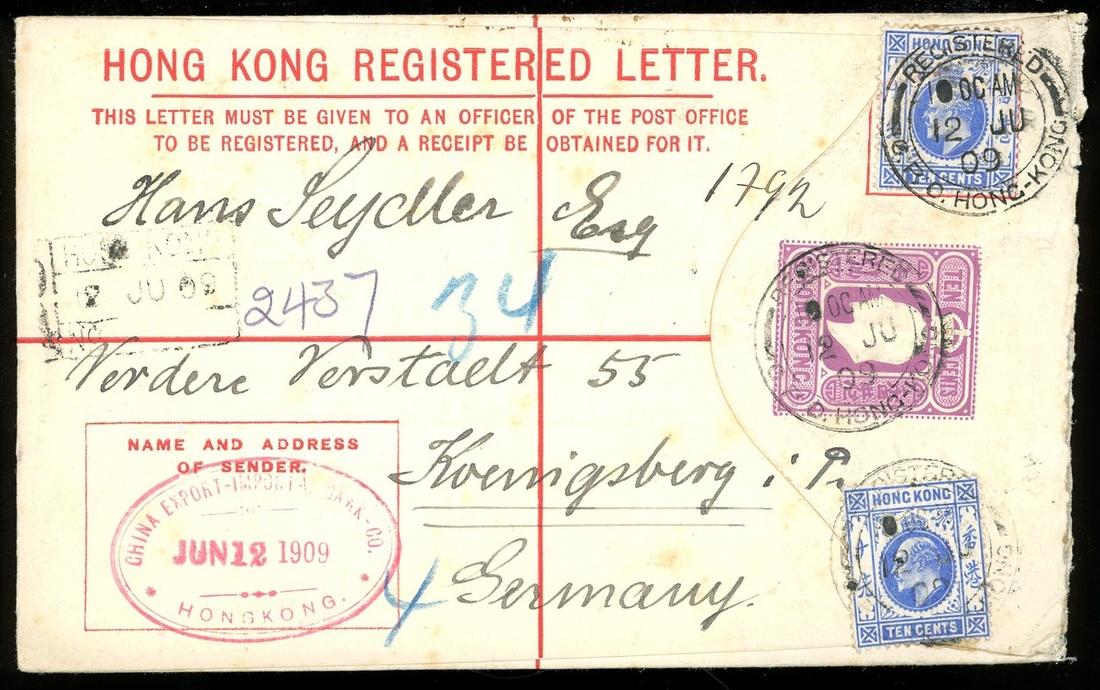 1908-09 three KE VII 10c. Registered Envelopes to Germany, all with uprated franking, tied by Hong Kong c.d.s. (16.11.08/ 12. 6.09/ 2.10.09) and registered seal in block. Fine