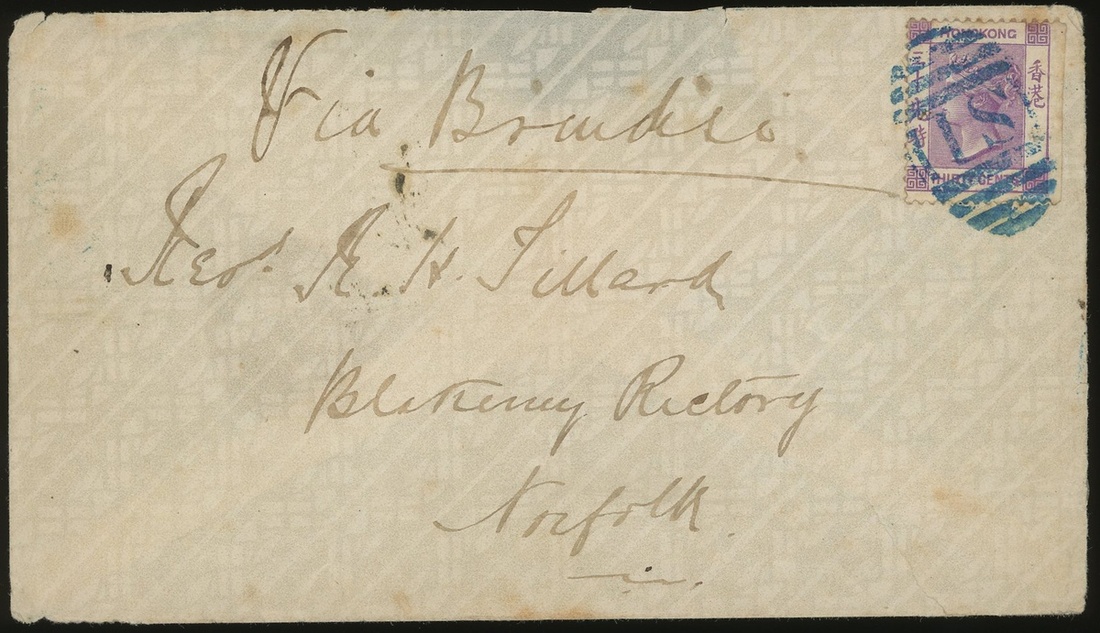 1875 (10 Mar.) a cover to Norfolk via Brindisi and Hong Kong (16.3.) bearing 30c. mauve tied by ‘S1’ in blue with Shanghae c.d.s. in blue on reverse.