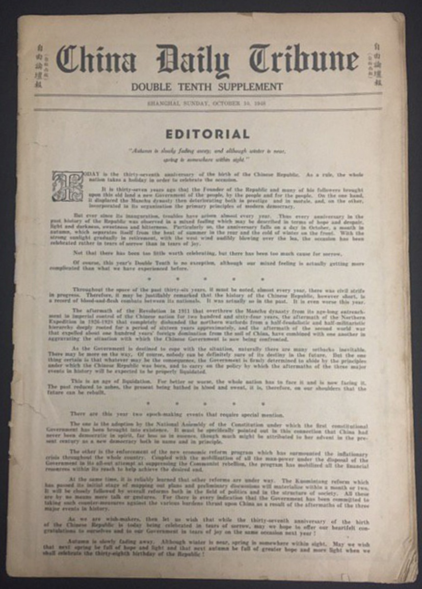 1948 (10 Oct.) a magazine of "China Daily Tribune" Double Tenth Supplement. Many precious historical materials and pictures. Text in English.