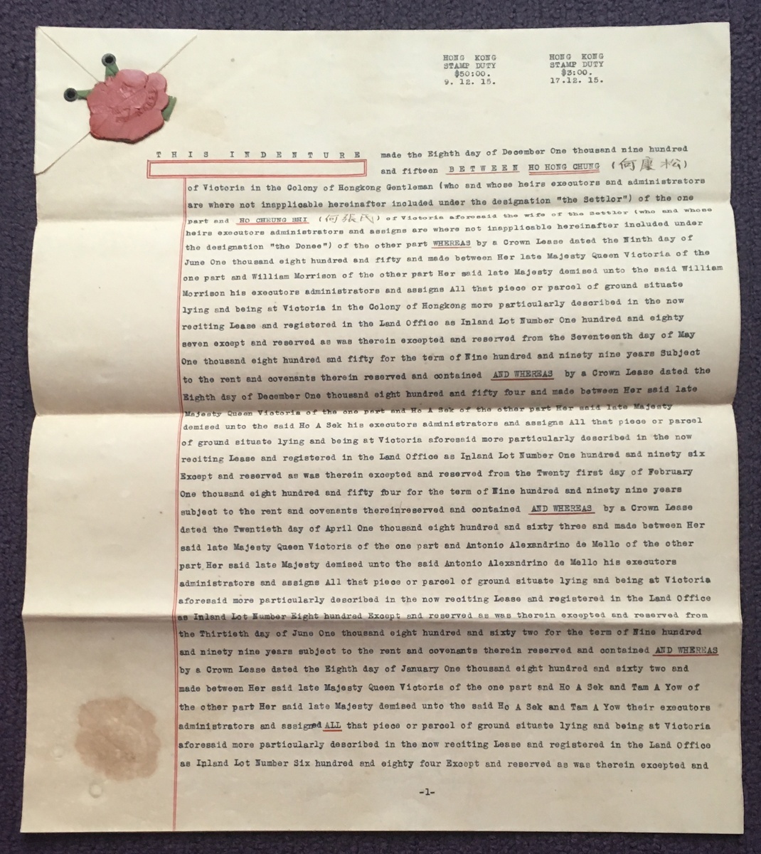 1915 (8 Dec.) Hong Kong Indenture with perf.14 colours issues $3.