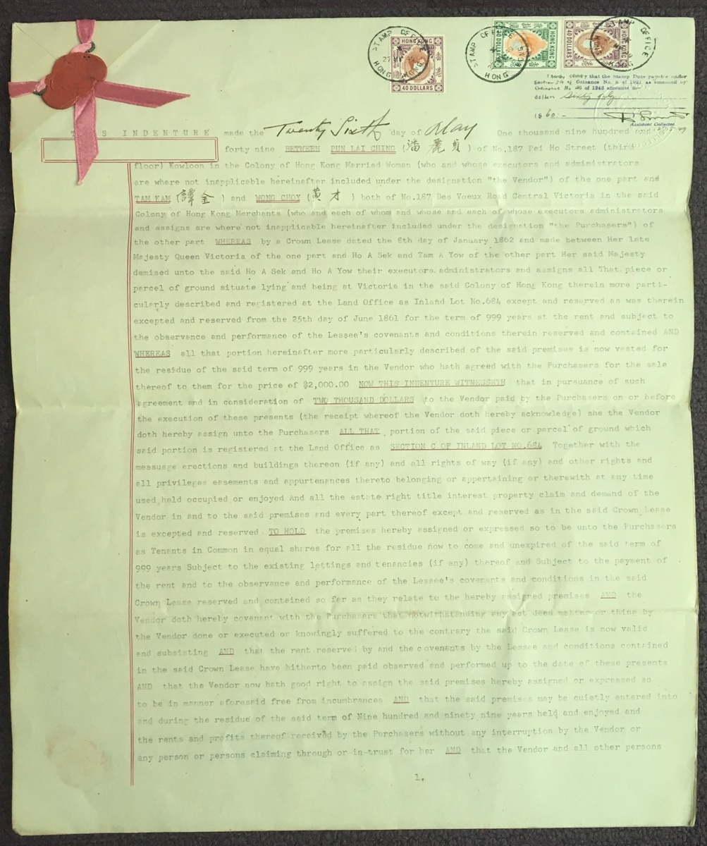 1949 (27 May) Hong Kong Indenture with perf.14 new colours issues $40 (2), $20 (1).