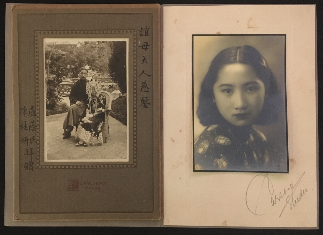 1920s two old Chinese photos, mounted by thick card. Teenage girl Photo taken at Shanghai, and wedding photo taken at Macao.