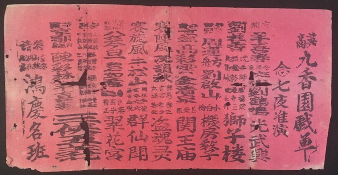 A sheet of drama list for Jiu Xiang Yuan Theater from late Qing Dynasty. Woodcut printing with some insect hole.