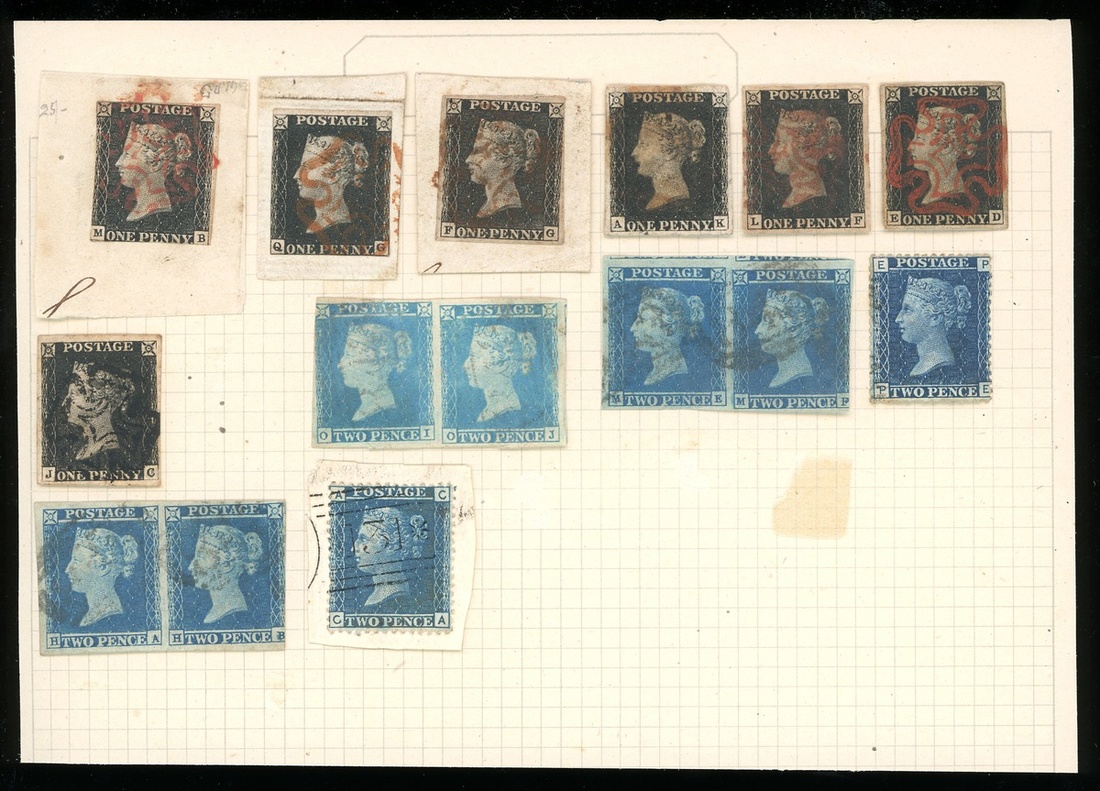 Great Britain - 1840 one penny black, 3 pieces and 4 copies used, two penny blue 3 pairs imperf and 2 singles perf. used, good to fine.