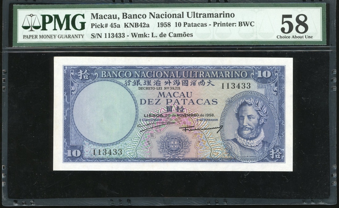 Banco Nacional Ultramarino, 10 patacas, 1958, serial number 113433, (Pick 45a), PMG 58, choice about uncirculated.