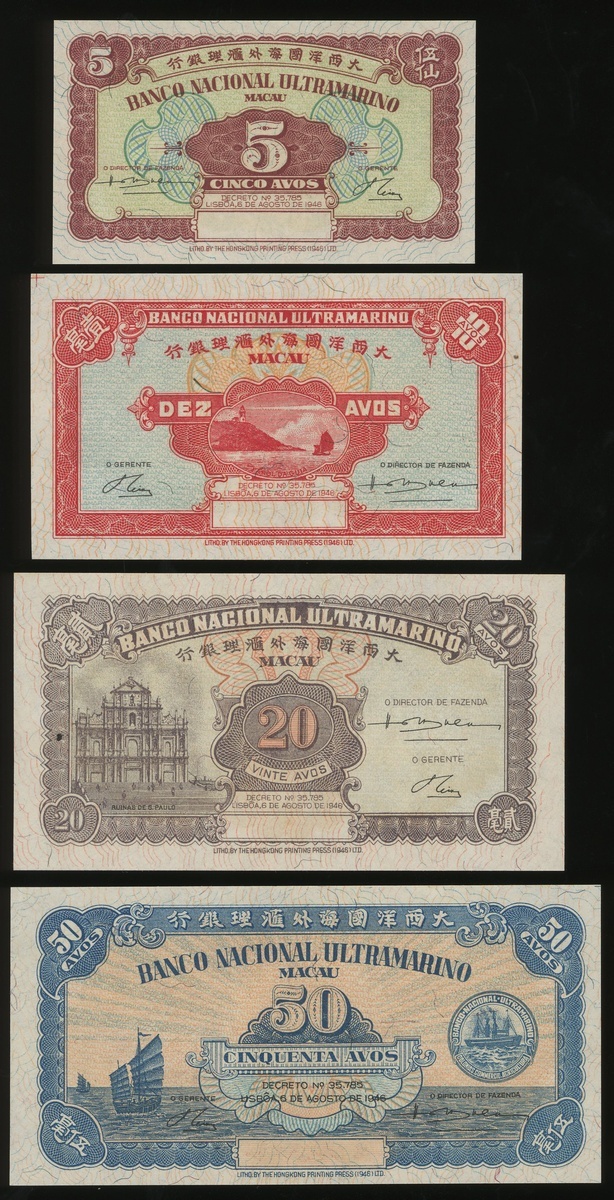 Banco Nacional Ultramarino, lot of 4x fractional notes consisting of 5, 10, 20 and 50 Avos, remainders, 6.8.1946, (Pick 35r, 36r, 37r, 38r), uncirculated (4)