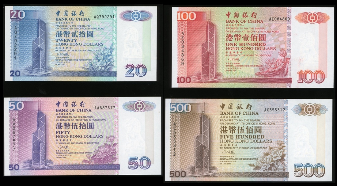 Bank of China, short set of notes from the $20 to $500, all dated 1.1.1994, uncirculated (4)