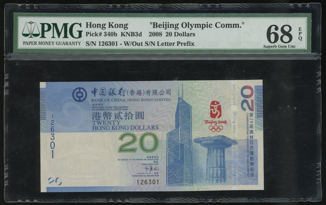 Bank of China, $20, 1.1.2008, serial number 126301, Beijing Olympic commemorative issue,