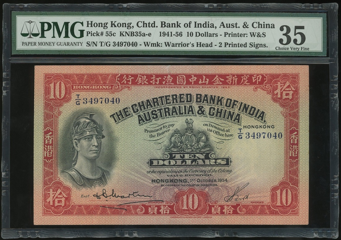 The Chartered Bank of India, Australia and China, $10, 1.10.1954, serial number T/G 3497040, (Pick 55c), PMG 35 Choice Very Fine
