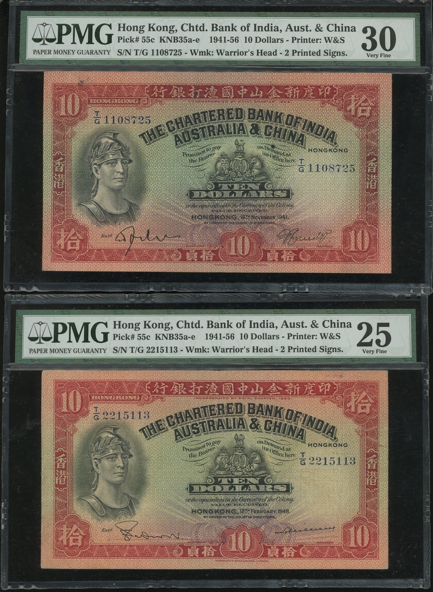 The Chartered Bank of India, Australia and China, a pair of $10, 16.11.1941 and 12.2.1948, serial numbers T/G 1108725 and T/G 2215113, (Pick 55c), graded PMG 30 Very Fine and 25 Very Fine (The Northern Collection) (2)