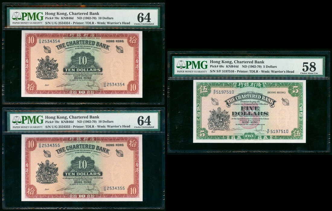 The Chartered Bank, $10, no date, near consecutive serial numbers U/G 2534354 and 355, also a $5, no date, serial number S/F 5197510,