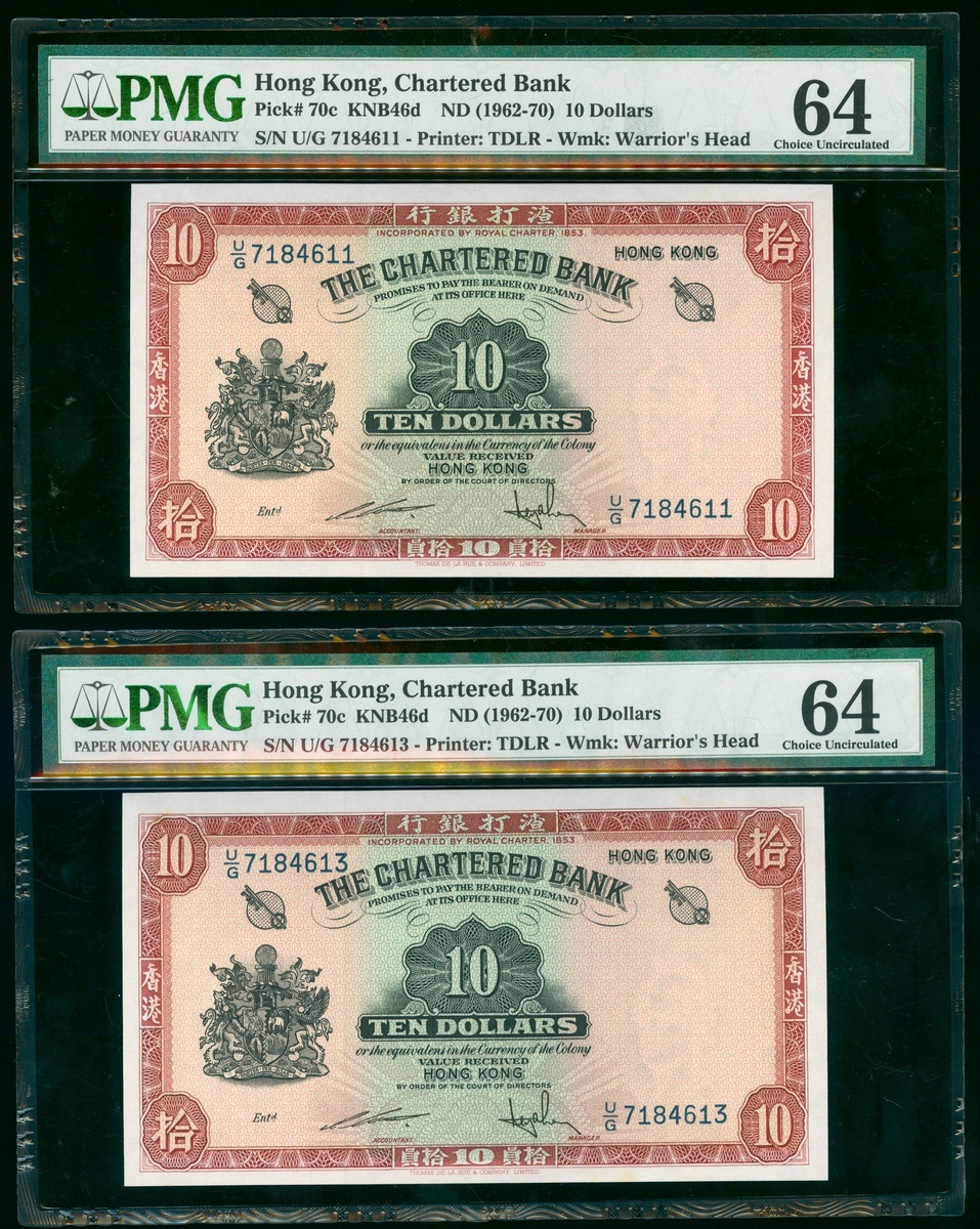 The Chartered Bank, $10, no date, near consecutive serial numbers U/G 7184611 and 613, (Pick 70c), both graded PMG 64 (2)