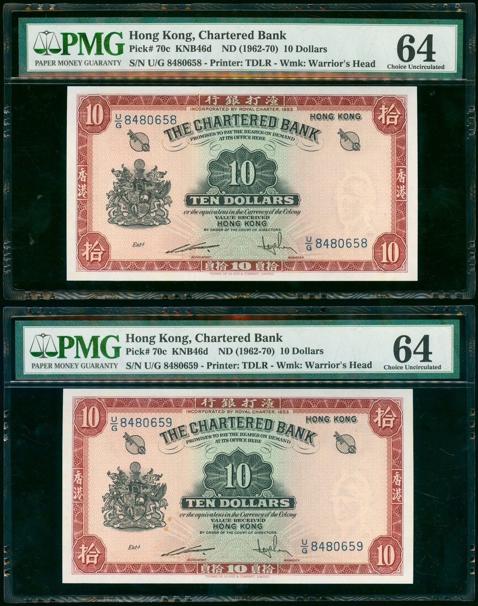 The Chartered Bank, $10, no date, consecutive serial numbers U/G 8480658 and 659, (Pick 70c), both graded PMG 64 (2)