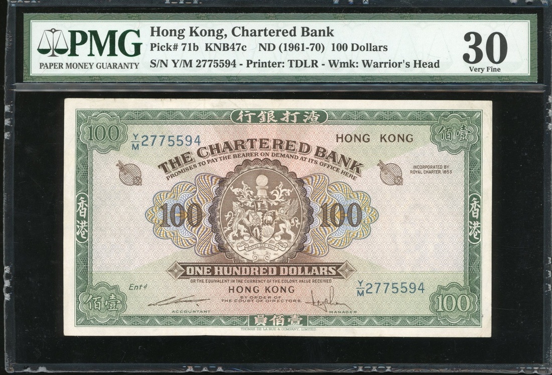 The Chartered Bank, $100, ND(1961-70), serial number Y/M2775594, green and brown, 'key' at top left and right,