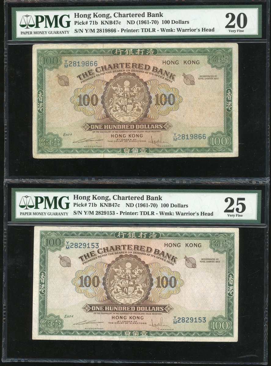 The Chartered Bank, a pair of $100, ND(1961-70), serial number Y/M2819866, Y/M2829153, green and brown, 'key' at top left and right,